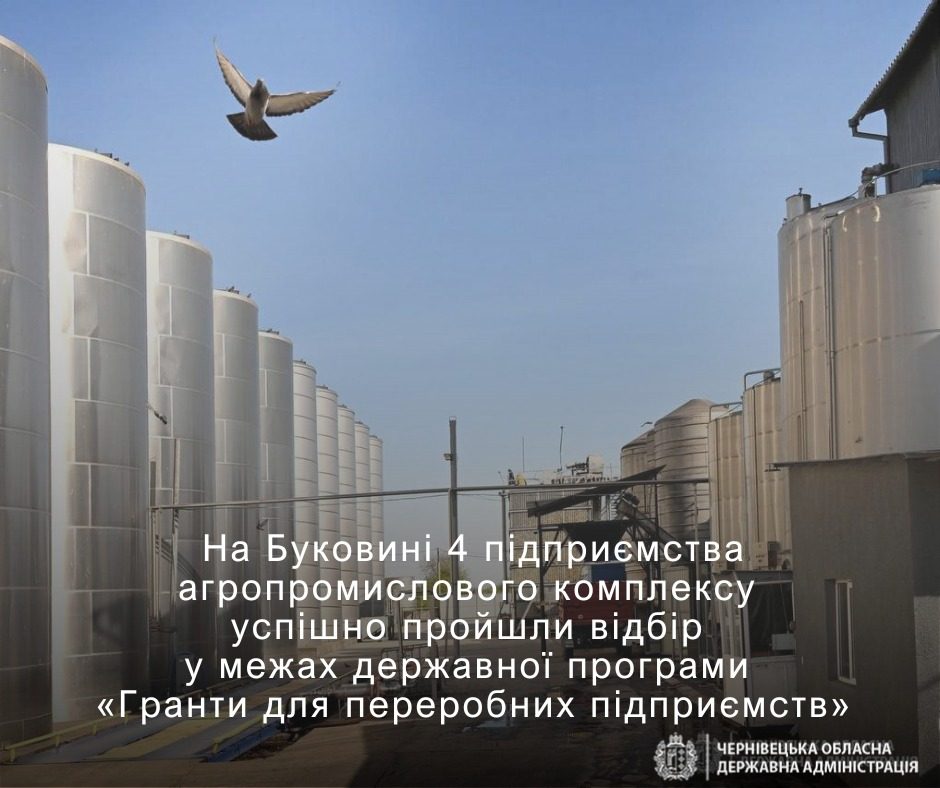 Цього року 4 підприємства агропромислового комплексу Чернівецької області успішно пройшли відбір у межах державної програми «Гранти для переробних підприємств». Після виконання умов співфінансування вони зможуть залучити понад 12,5 млн грн держпідтримки для модернізації та розвитку виробництва.