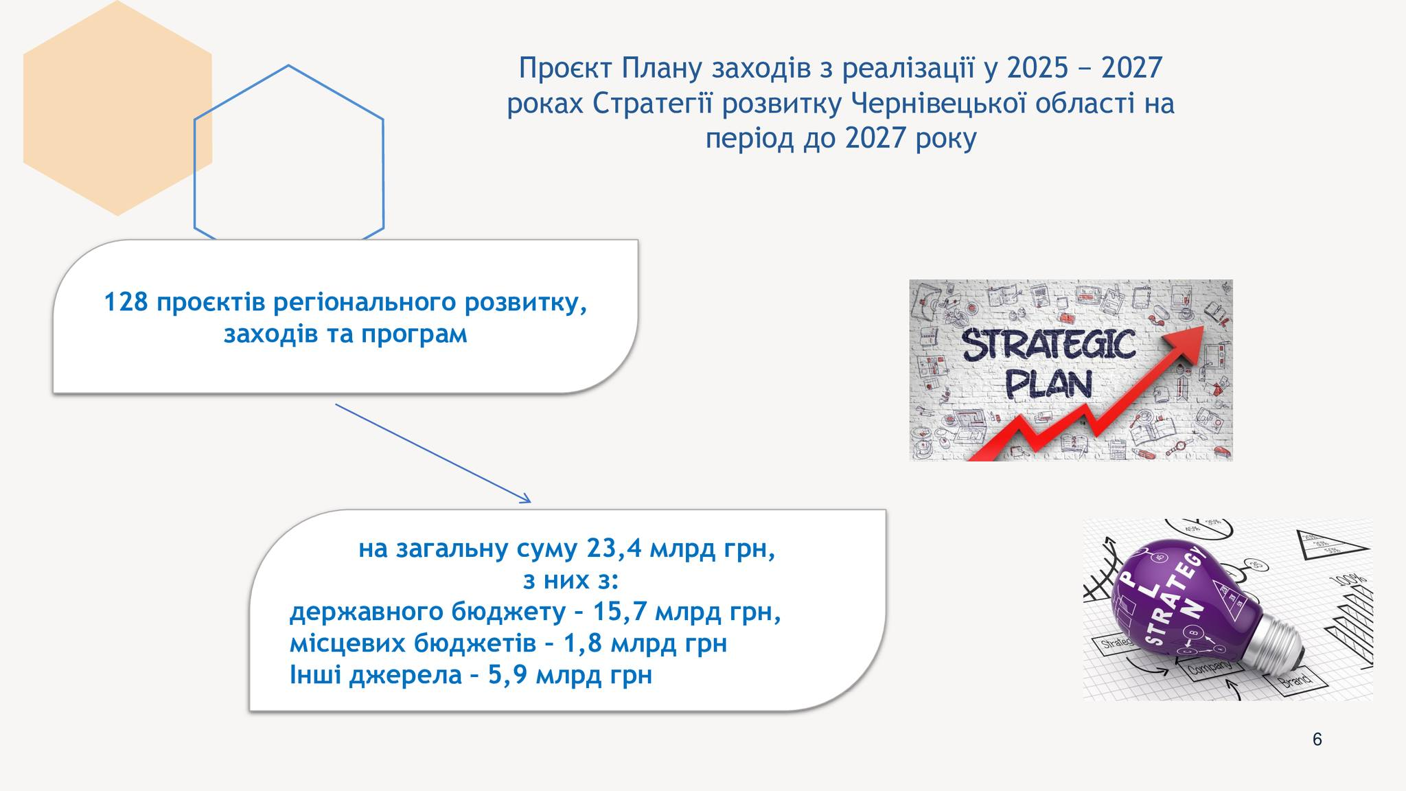 Зазначимо, що проєкт Плану заходів включає 128 ініціатив та програм регіонального розвитку, а ще - заходів, що надійшли від структурних підрозділів Чернівецької обласної військової адміністрації, територіальних органів міністерств та інших центральних органів виконавчої влади, районних військових адміністрацій, територіальних громад, установ та організацій Чернівецької області.