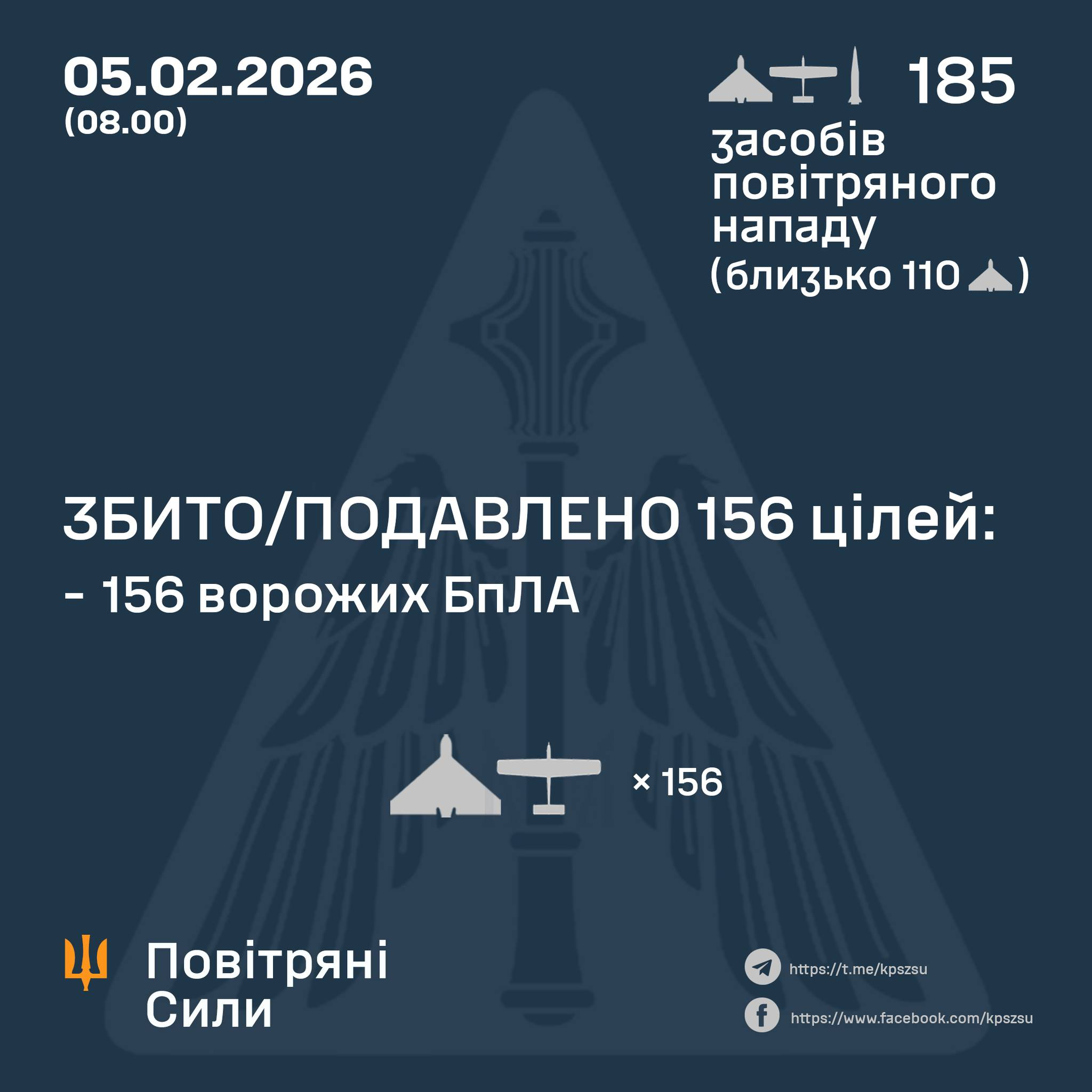 За повідомленням Повітряних Сил України, у ніч на 5 лютого (з 18:00 4 лютого) противник атакував двома балістичними ракетами Іскандер-М із ТОТ АР Крим, а також 183 ударними БпЛА типу Shahed, Гербера, Італмас та безпілотниками інших типів із напрямків: Брянськ, Орел, Курськ, Міллєрово, Приморсько-Ахтарськ – рф., Донецьк - ТОТ України. Близько 110 із них – типу "Shahed".