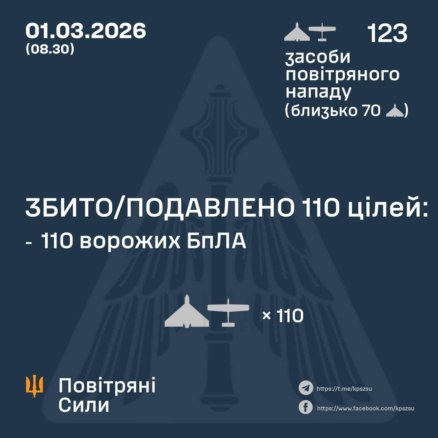 За інформацією Повітряних Сил України, у ніч на 01, березня (з 18:00 28 лютого) противник атакував 123 ударними БпЛА типу Shahed, Гербера, Італмас та безпілотниками інших типів із напрямків: Курськ, Міллєрово, Приморсько-Ахтарськ – рф., Гвардійське – ТОТ АР Крим, близько 70 із них – "шахеди".