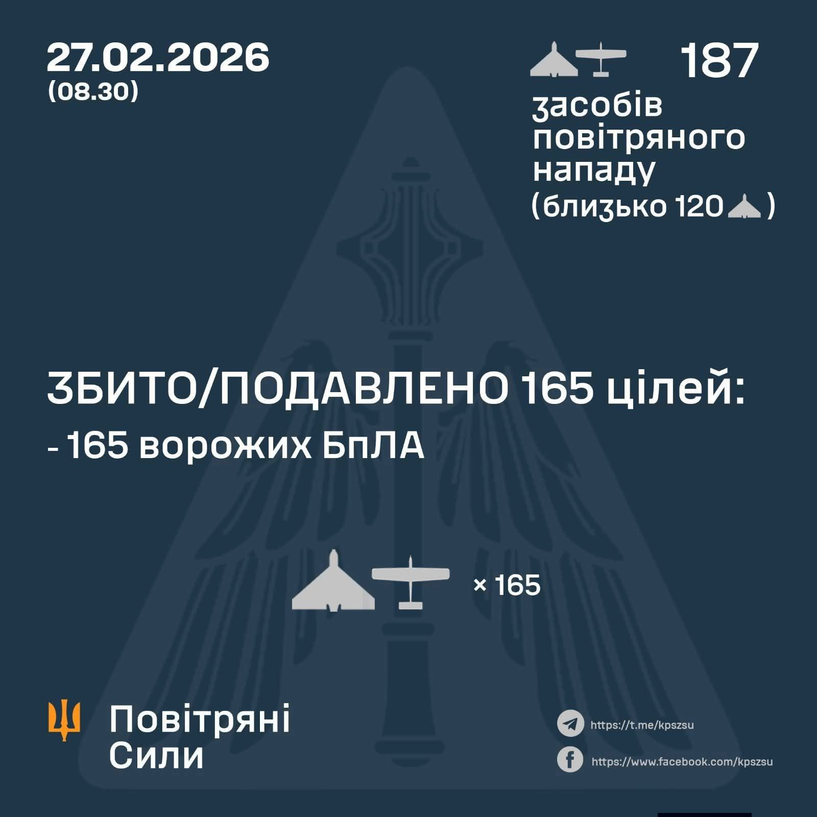За повідомленням Повітряних Сил України, у ніч на 27 лютого (з 18:00 26 лютого) противник атакував 187 ударними БпЛА типу Shahed, Гербера, Італмас та безпілотниками інших типів із напрямків: Брянськ, Орел, Шаталово, Приморсько-Ахтарськ - рф, Гвардійське - ТОТ АР Крим, із них близько 120 – "шахеди".