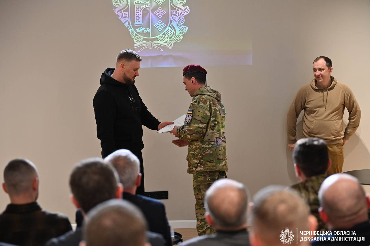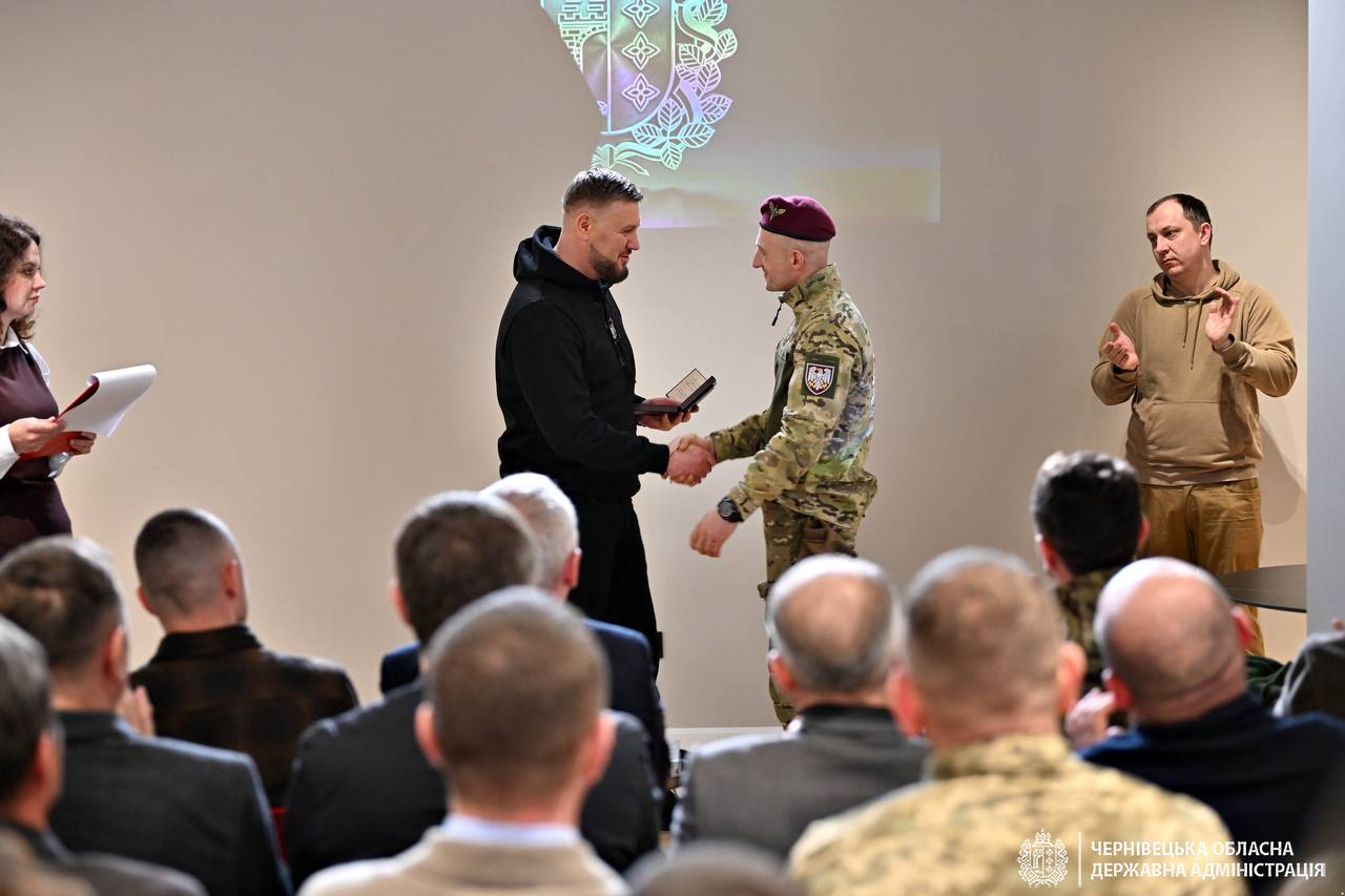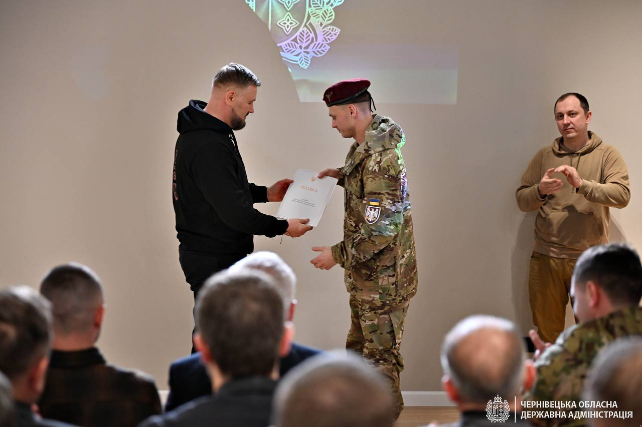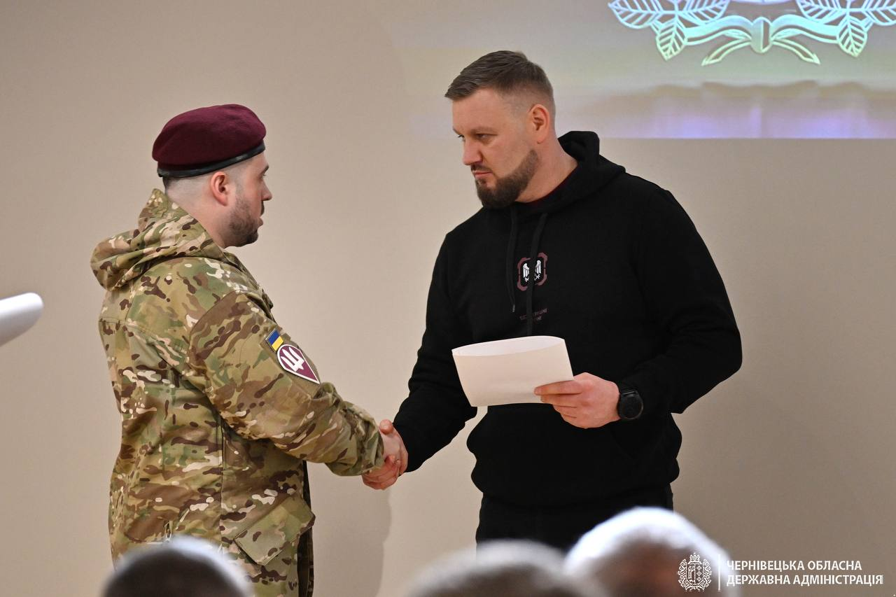 За дорученням Президента України Володимира Зеленського, під час відкриття публічного простору 82-ї Десантно-штурмової Буковинської бригади начальник Чернівецької ОВА Руслан Осипенко передав бійцям високі державні нагороди.