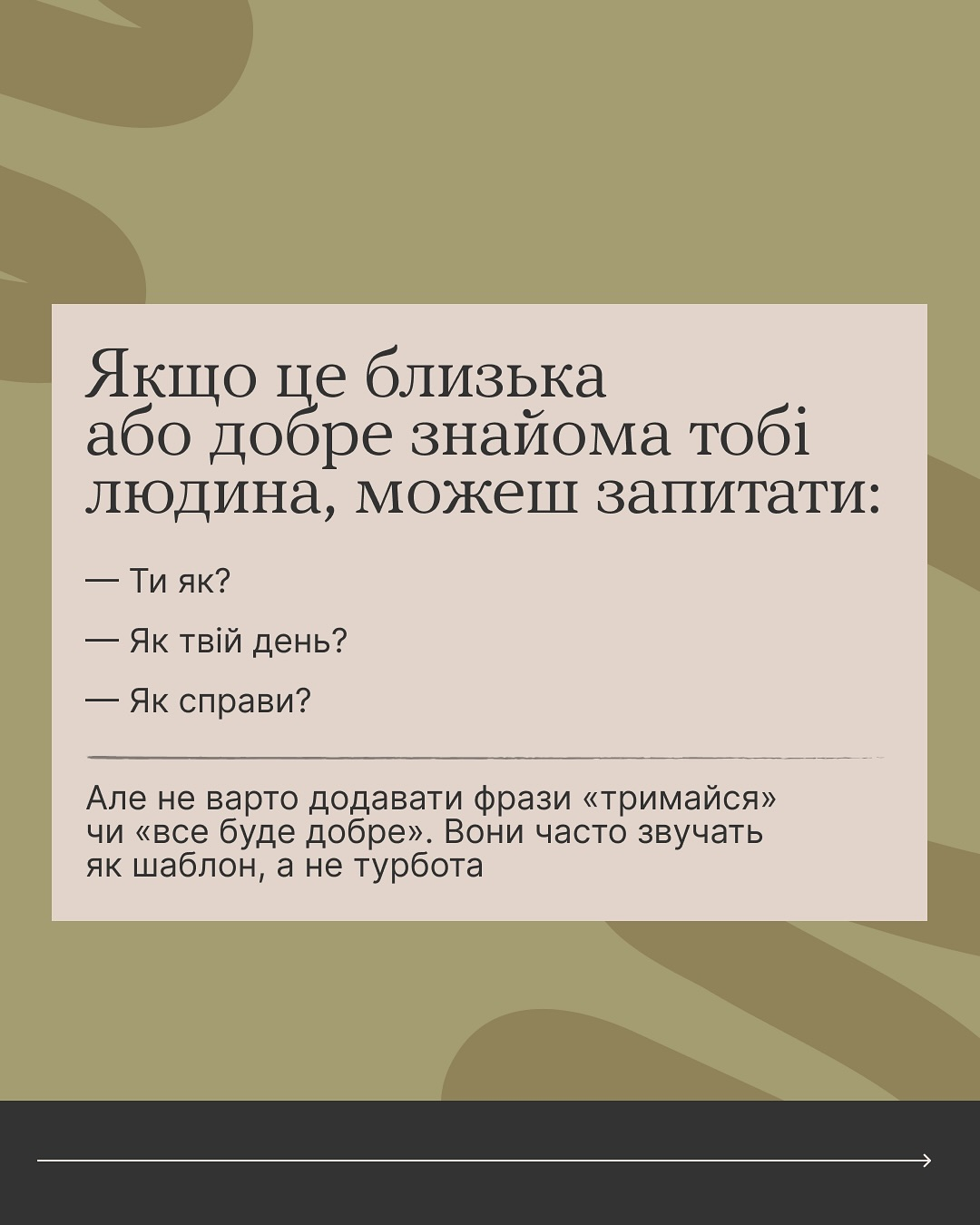А в голові зберігай правило: не такі важливі ідеальні слова, як людяність — спокій, щирість, повага.