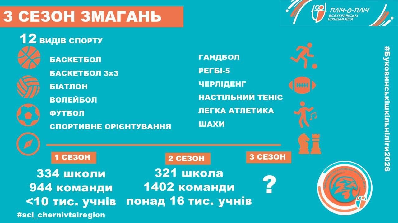 Наразі на участь у цьогорічних змаганнях уже зареєстровано 152 заклади загальної середньої освіти (із 322 можливих). Вони сформували 969 команд, які увійшли до складу Буковинських шкільних ліг та змагатимуться за можливість представляти область на всеукраїнському етапі.