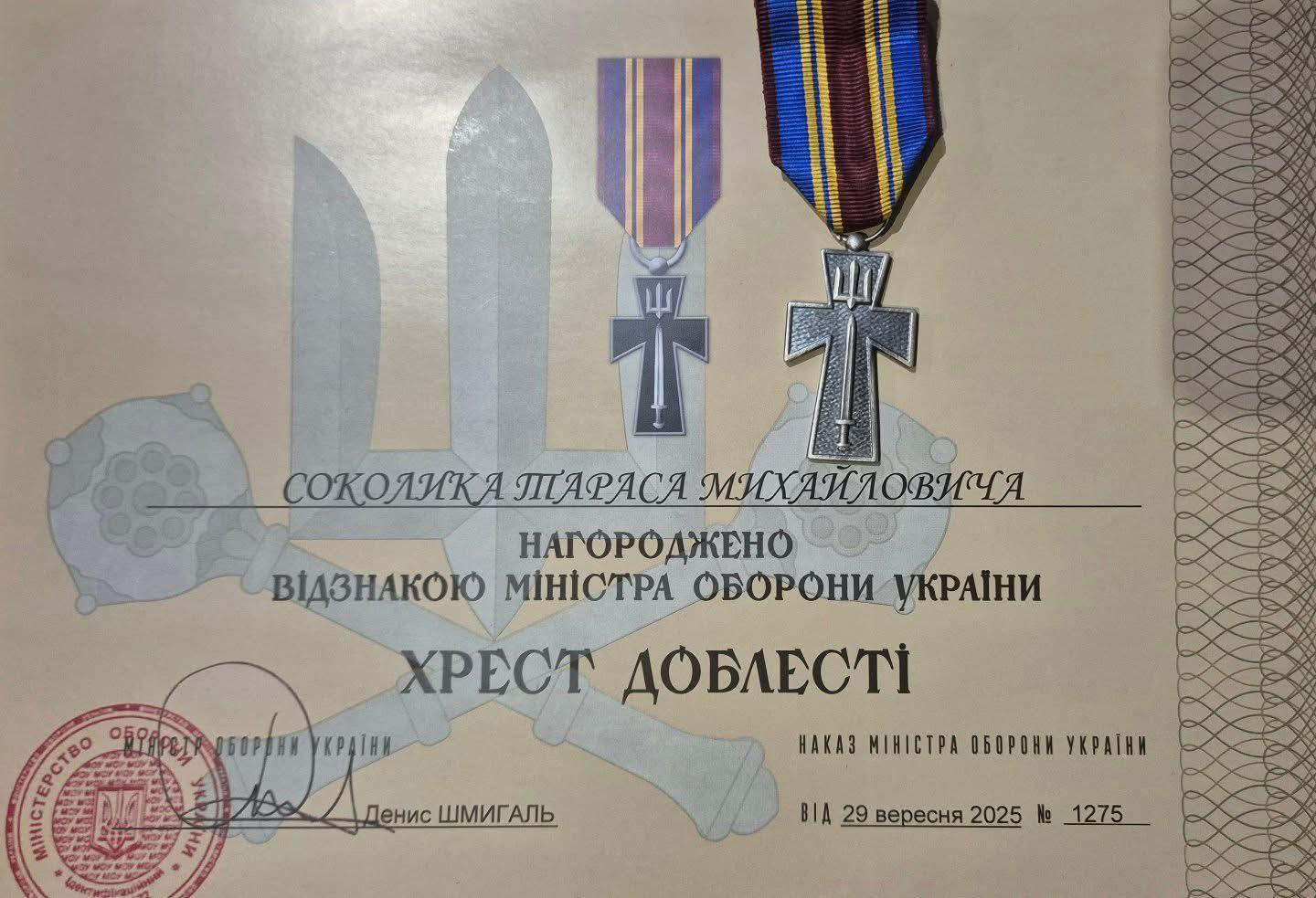 Буковинець Тарас Соколик отримав відзнаку Міністра оборони України "Хрест Доблесті".