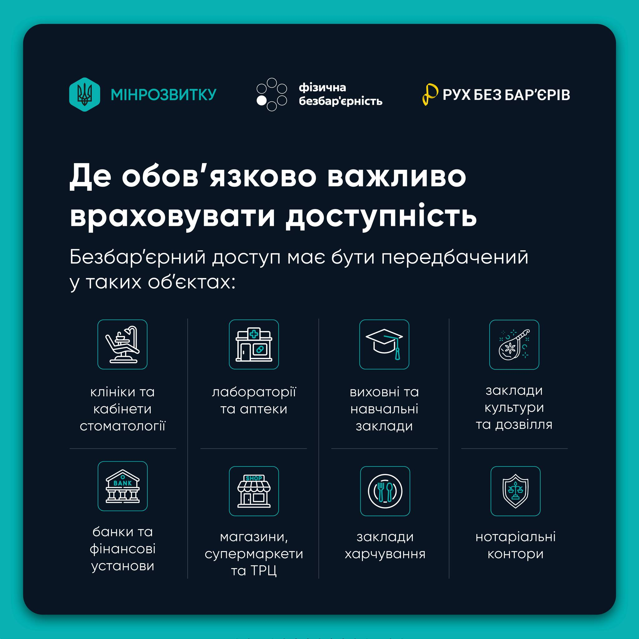 В Україні діють державні будівельні норми «Інклюзивність будівель і споруд», які встановлюють обов’язкові вимоги до створення безперешкодного доступу для всіх маломобільних груп населення.