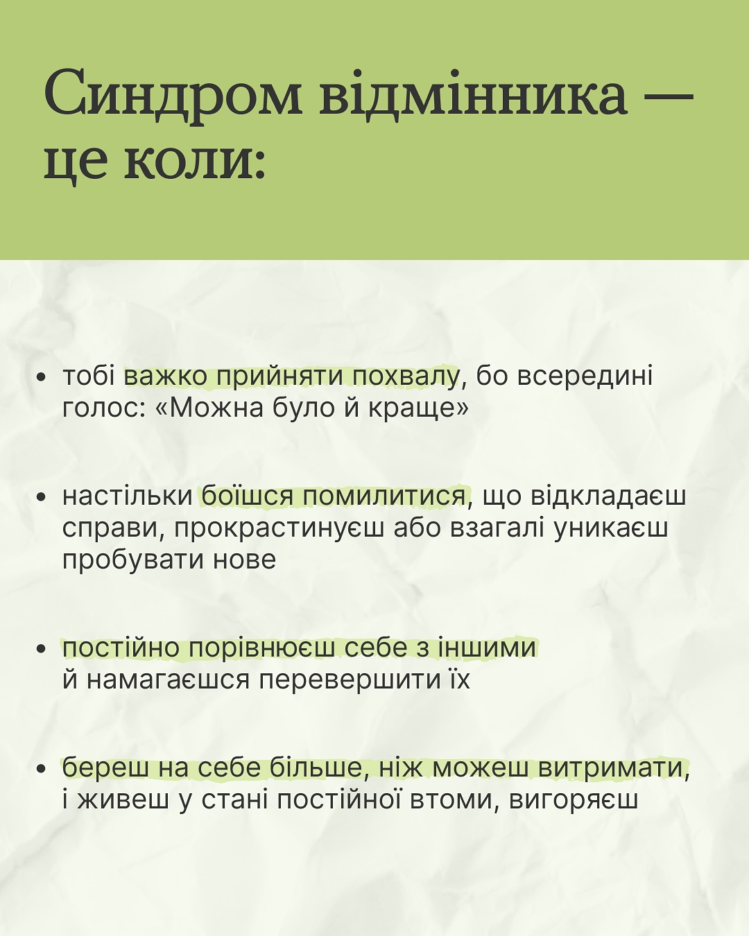 Гортай карусель, щоб перевірити, чи не синдром відмінника це.